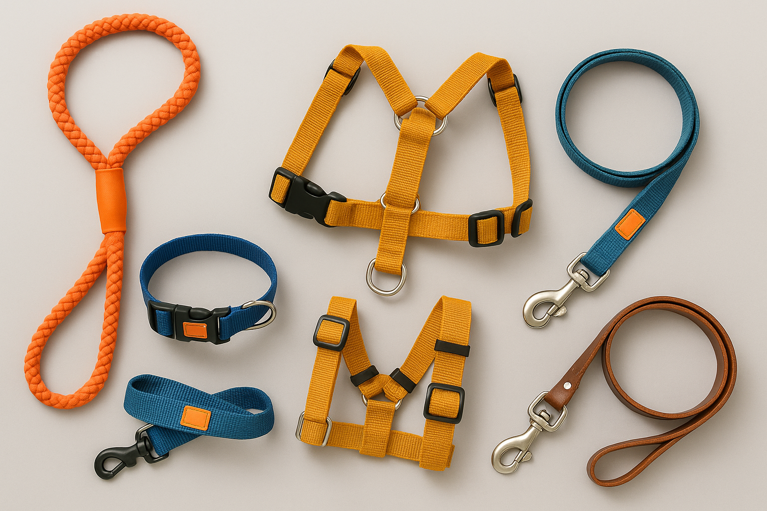Collars, harnesses, and leashes.
